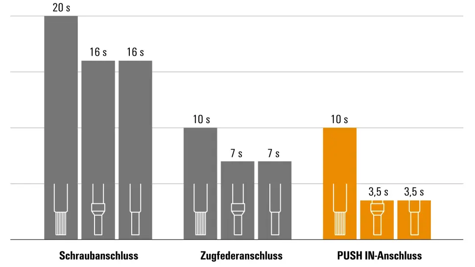 En comparación con las conexiones directas, PUSH IN ahorra hasta un 50 % del tiempo de cableado porque simplemente insertas el conductor en la unidad de sujeción para establecer la conexión.