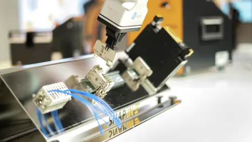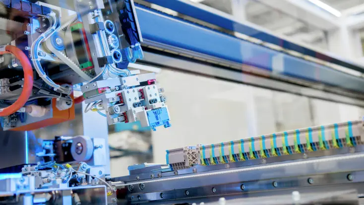 El diseño moderno y uniforme de los productos PUSH IN ya ofrece muchas ventajas en el cableado y las pruebas. Pero la conexión sin herramientas y un diseño consistente también son importantes para los procesos de montaje y cableado automatizados del futuro. Estos factores ya se tienen en cuenta en nuestros productos PUSH IN. Por ejemplo, el contorno de carcasa de nuestros bornes modulares de la serie A ya está diseñado para el montaje automático de carriles. Los bordes rectos proporcionan una sujeción segura para la pinza de un brazo robótico. Por lo tanto, las conexiones PUSH IN son más fáciles de manejar que otros métodos de conexión, incluso para las máquinas de cableado automático.